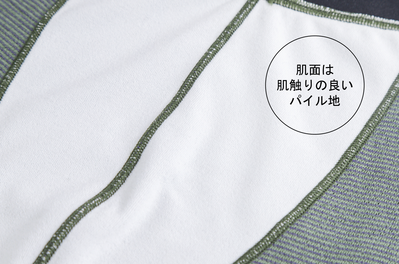 縫い目部分は肌当たりを考慮し、凹凸を軽減するミシン仕様でフラットな仕上がりです。